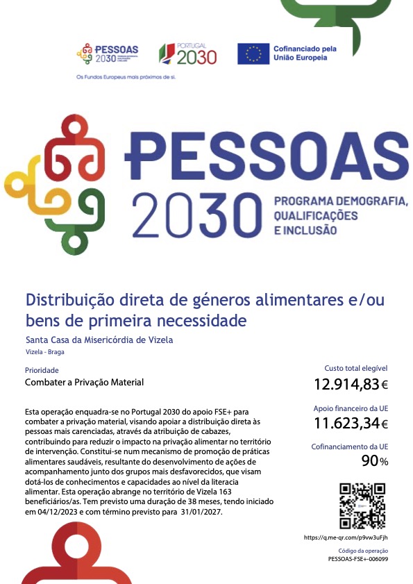 Esta operação enquadra-se no Portugal 2030 do apoio FSE+ para combater a privação material, visando apoiar a distribuição direta às pessoas mais carenciadas, através da atribuição de cabazes, contribuindo para reduzir o impacto na privação alimentar no território de intervenção. Constitui-se num mecanismo de promoção de práticas alimentares saudáveis, resultante do desenvolvimento de ações de acompanhamento junto dos grupos mais desfavorecidos, que visam dotá-los de conhecimentos e capacidades ao nível da literacia alimentar. Esta operação abrange no território de Vizela 163 beneficiários/as. Tem previsto uma duração de 38 meses, tendo iniciado em 04/12/2023 e com término previsto para 31/01/2027.