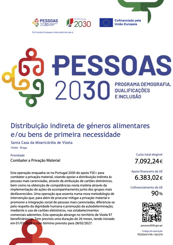 Esta operação enquadra-se no Portugal 2030 do apoio FSE+ para combater a privação material, visando apoiar a distribuição indireta às pessoas mais carenciadas, através da atribuição de cartões eletrónicos, bem como na obtenção de competências nesta matéria através da implementação de ações de acompanhamento junto dos grupos mais desfavorecidos. Uma operação que assenta numa nova metodologia de intervenção que, para além de procurar mitigar a privação material e promover a integração social de pessoas mais carenciadas, diferencia-se pelo respeito da dignidade humana e promoção da autodeterminação, mediante o uso de cartões eletrónicos, nos estabelecimentos comerciais aderentes. Esta operação abrange no território de Vizela 97 beneficiários/as. Tem previsto uma duração de 26 meses, tendo iniciado em 01/01/2025 e com término previsto para 28/02/2027.